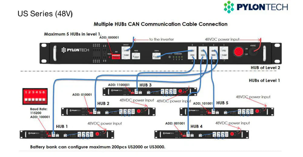 Le Pylontech LV-HUB est un hub de communication avancé, conçu pour centraliser et optimiser la gestion des systèmes de batteries LiFePO4 de Pylontech, notamment le modèle US3000C. En agissant comme un centre de communication CAN/RS485, le LV-HUB permet une connexion en parallèle de plusieurs groupes de batteries 48 V, facilitant ainsi une surveillance et un contrôle précis de la batterie et de ses performances.